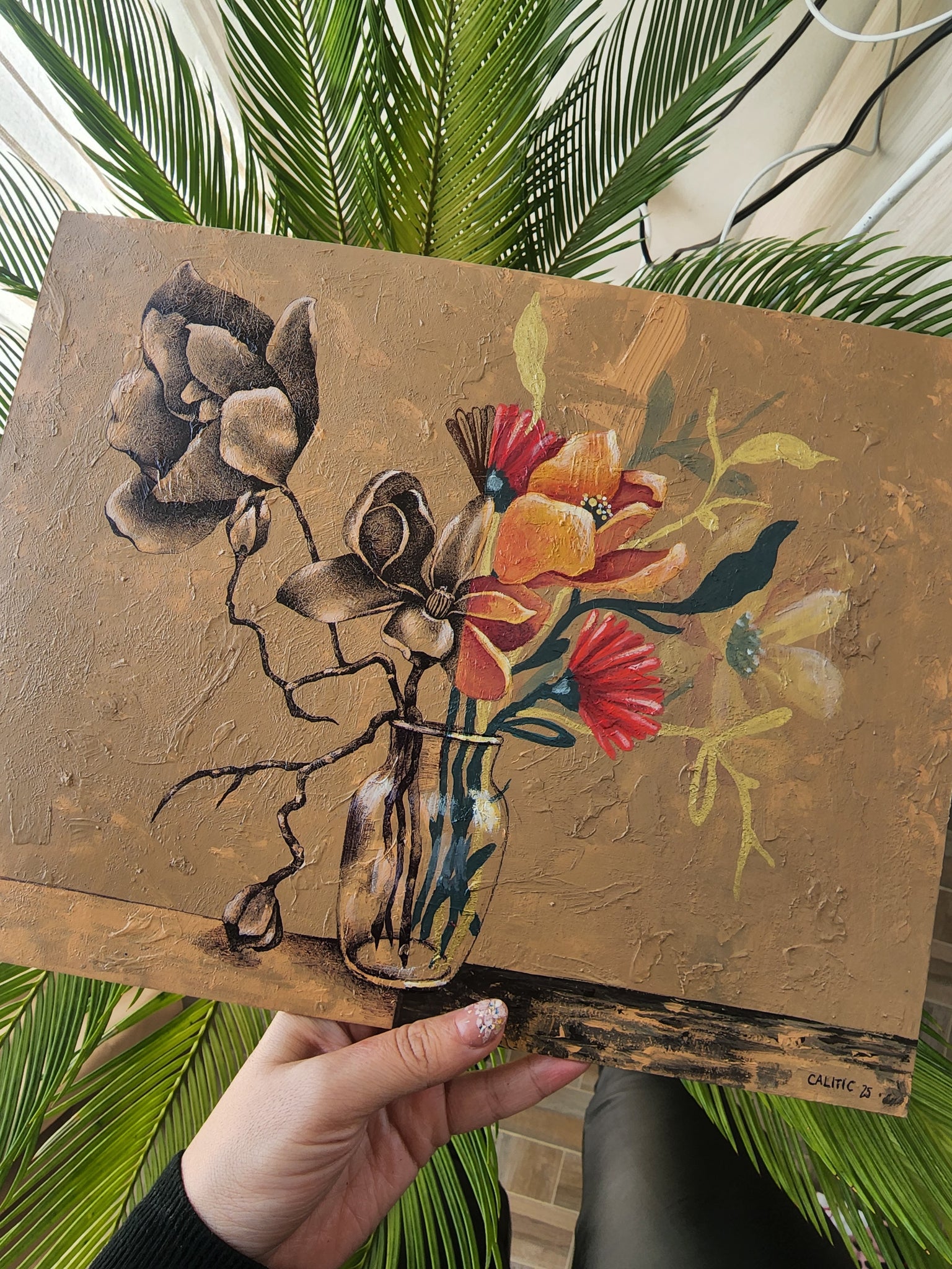 Obra inspirada en las dos versiones que ahbita dentro de una misma persona: la analítica, la que tiene dolores emocionales, la que se restringe... y la creativa, la libre y espontánea.